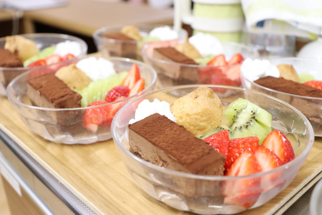 この日のおやつは、チョコレートケーキでしたが、フルーツを飾り付けしているユニットもありました☺