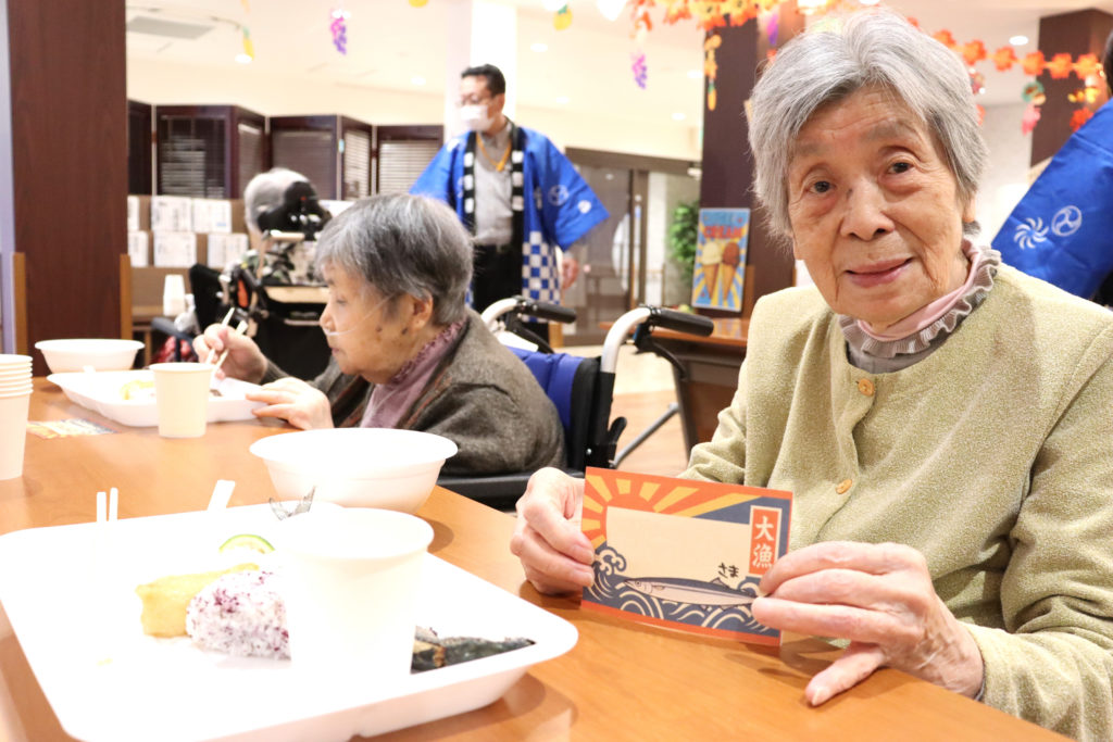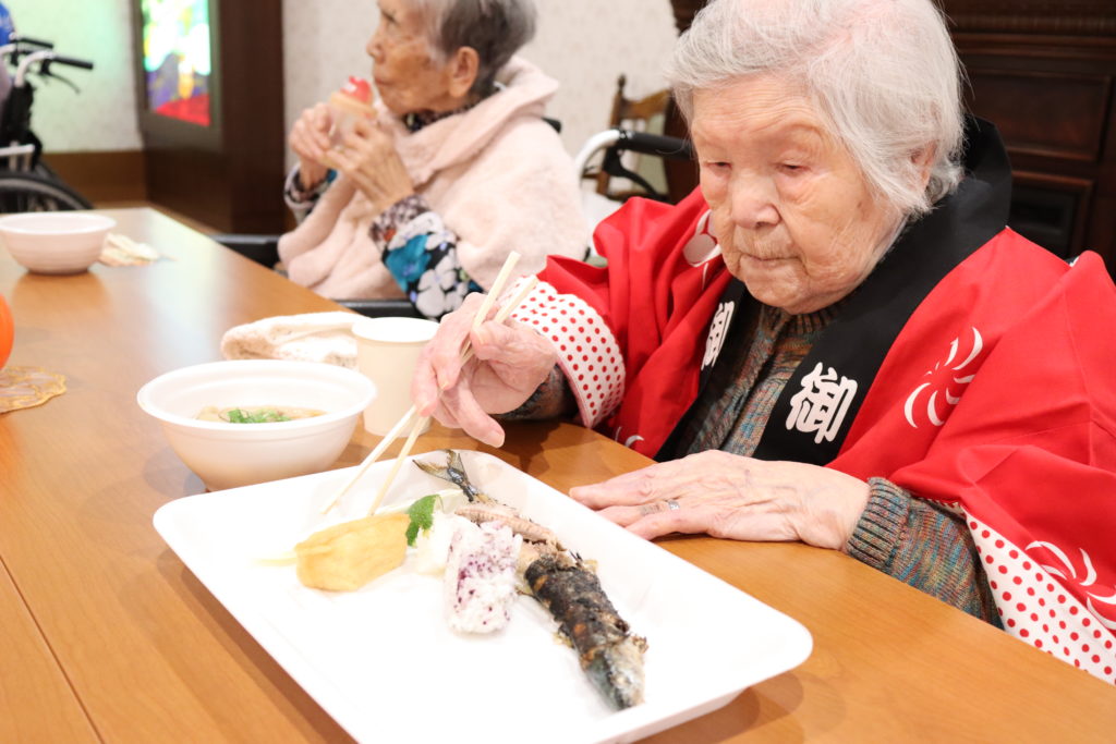 秋刀魚とおにぎりとお稲荷さんと。おかわりしている入居者様もいらっしゃいました☺